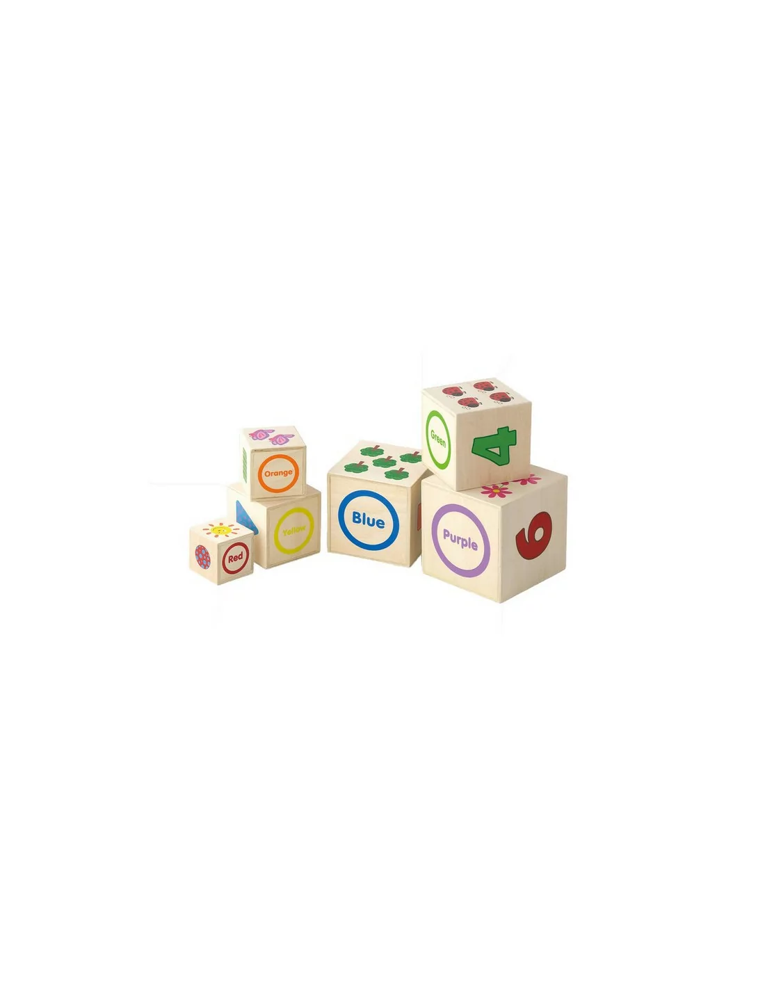 🧩 Zestaw zawiera 6 drewnianych kostek w różnych rozmiarach, otwartych z jednej strony, dzięki czemu można je łatwo wkładać jedna w drugą lub układać w wieżę.